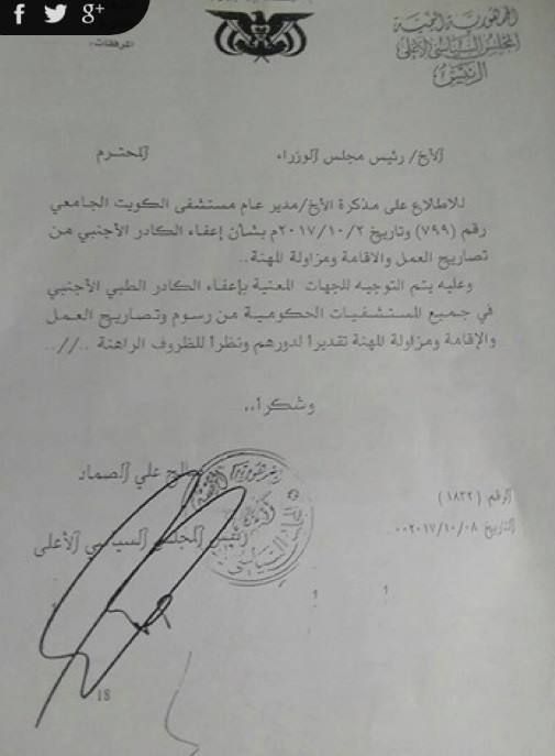 وأظهرت وثيقة توجيه رئيس ما يسمى بـ"المجلس السياسي" القيادي الحوثي صالح الصماد، "الجهات المعنية بإعفاء الكادر الطبي الأجنبي في جميع المستشفيات الحكومية من رسوم وتصاريح العمل والاقامة ومزاولة المهنة".