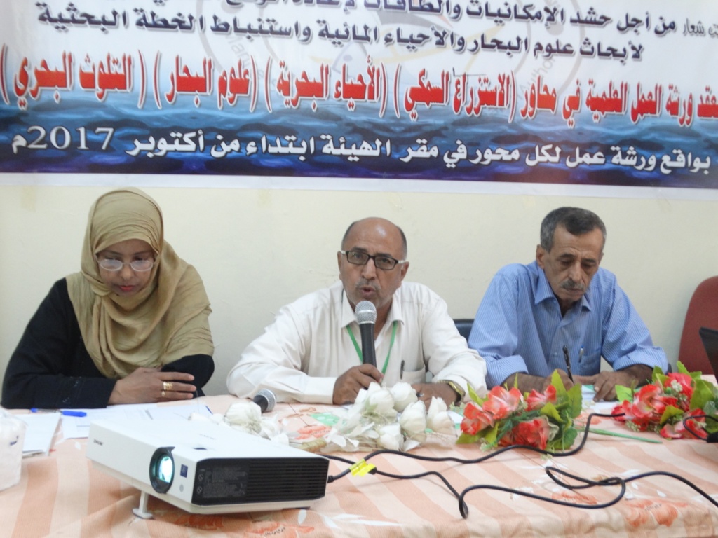برئاسة الدكتورة / هناء عبدالرشيد احمد رئيس هيئة ابحاث علوم البحار .والتي قدمت فيها ستة اوراق عمل .حيث قدم محمدعبدالله سعد ملخصا حول الانجازات العلمية لقسم علوم البحار نموذج دراسة خيار البحر .وقدم صالح سالم عوض ورقة عمل بعنوان الظروف الاوكيانوجرافية وتأثيرها على نشوءوتواجد التجمعات السمكية والاحياء البحرية .كما تناول احمدحسين مشيب في ورقته الاحياء القاعية في المناطق الساحلية لمدينة عدن .وقدم جمال باوزير ورقة علمية عن نشاط وانجازات مركز ابحاث البيئة البحرية والتلوث البحري .فيما تناولت فائزة الكاف عرضا مختصرا عن التلوث النفطي والعضوي .واختتمت الورشة بورقةعمل مقدمة من محمدحسن باشعيب حول مختبرات البيئة البحرية .