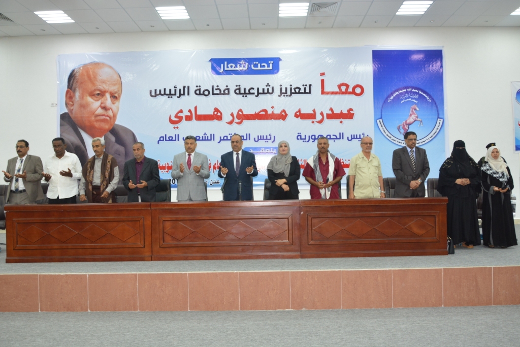 وشدد البيان الختامي الصادر عن اللقاء الذي عقد ،اليوم ،في العاصمة المؤقتة عدن، بمشاركة أكثر من 1173 عضو، تحت شعار (معا لتعزيز شرعية فخامة الرئيس عبد ربه منصور هادي رئيس الجمهورية رئيس المؤتمر الشعبي العام ) على ضرورة الاستمرار في دعم مخرجات الحوار الوطني وتقديم الدعم اللا محدود للمقاومة الشعبية والجيش الوطني المدعوم من التحالف العربي في مختلف جبهات القتال و بناء دولة المؤسسات في جميع المناطق المحررة ضمن النظام والقانون .