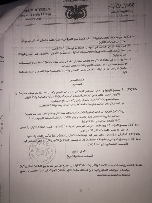 وحددت الوزارة عدد من الإجراءات واللوائح والقوانين المنظمة لعمل ملاك محطات الكهرباء، والتي تسعى من خلالها المليشيا الى خصخصة عدد من قطاعات الدولة، بينها الكهرباء، والتي تقوم برفض تشغيل المولدات الحكومية، بعد أن قامت باستثمار عددا من المولدات الحكومية التي نهبتها من المؤسسات الحكومية والخاصة، واستطاعت من خلالها تكوين امبراطورية مالية.