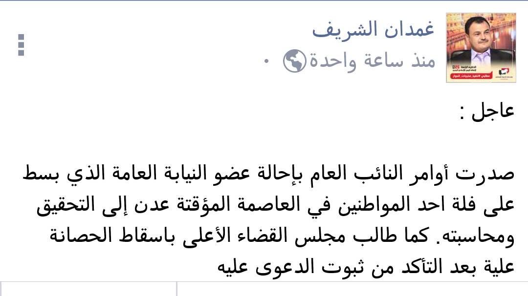 أكد السكرتير الصحفي لرئيس الوزراء،الأستاذ غمدان الشريف، بأن النائب العام للجمهورية، الدكتور علي أحمد الأعوش، أصدر اليوم توجيهات صارمة ،بإحالة عضو النيابة العامة الذي بسط على فلة أحد المواطنين في العاصمة المؤقتة عدن إلى التحقيق ومحاسبته.