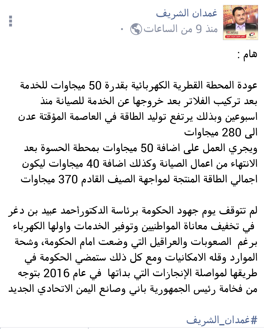 وقال السكرتير الصحفي لرئيس الوزراء في منشور بصفحته الرسمية على موقع فيسبوك، أطلع عليه " الميناء نيوز" اليوم :لم تتوقف جهود الحكومة برئاسة الدكتور أحمد عبيد بن دغر، يوما واحدا ،في تخفيف معاناة المواطنين، وتوفير الخدمات. .،وأولها الكهرباء ،برغم الصعوبات والعراقيل التي وضعت أمام الحكومة، وبرغم شحة الموارد وقلة الإمكانيات، ومع كل ذلك ستمضي الحكومة في طريقها لمواصلة الإنجازات التي بدأتها في عام 2016م ،بتوجيه من فخامة رئيس الجمهورية ،باني وصانع اليمن الإتحادي الجديد..