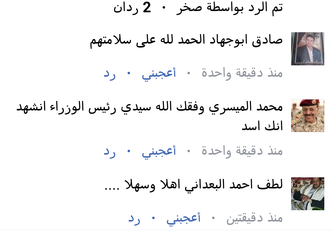 أما عبدالله اليافعي فقد نشر عدة تغريدة تعبر عن ابتهاجه وسعادته بعودة رئيس الوزراء، يختار منها "الميناء نيوز " قوله :سدد الله خطاك ونصرك على مليشيا الإنقلاب والبغي والتمرد .. وحقق على يديك ويدي فخامة الرئيس عبدربه منصور هادي، آمال وطموحات الشعب اليمني.