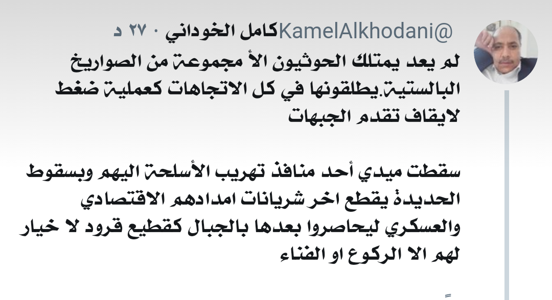 إلى ذلك قال الناشط السياسي كامل الخوذاني "لم يعد يمتلك الحوثيون سوى مجموعة من الصواريخ البالستية.يطلقونها في كل الاتجاهات كعملية ضغط لايقاف تقدم الجبهات (تقدم الجيش والمقاومة في جبهات القتال ).