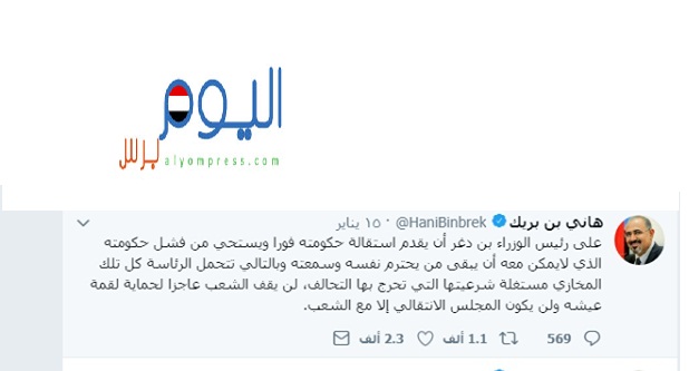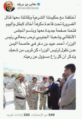 التغريدة الجديدة لـ " بن بريك " جاءت عقب ساعات من عودة حكومة بن دغر الى عدن ، عقب تفاهمات سعودية إماراتية ، أحرجت هاني بن بريك الذي كان قد تهور بعدد من التصريحات الصحفية التي إستبعد فيها عودة الحكومة الشرعية وممارسة مهامها من عدن.