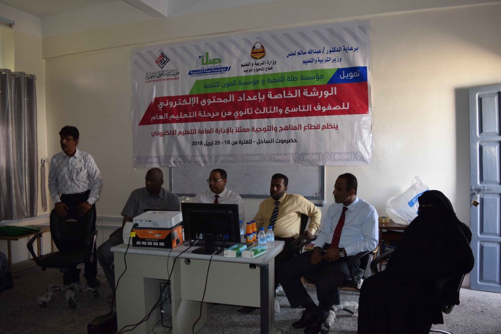بتمويل من مؤسسة العون للتنمية ومؤسسة صلة للتنمية نظم قطاع المناهج والتوجيه بمكتب وزارة التربية والتعليم بمحافظة حضرموت ورشة خاصة بإعداد المحتوى الإلكتروني للصفوف التاسع والثالث الثانوي من مرحلة التعليم العام بثانوية بلقيس بالمكلا.