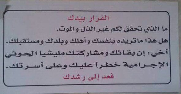 وجاء فيها: أخي إن بقائك ومشاركتك مليشيا الحوثي الإجرامية خطرا عليك وعلى أسرتك، فعد إلى رشدك".