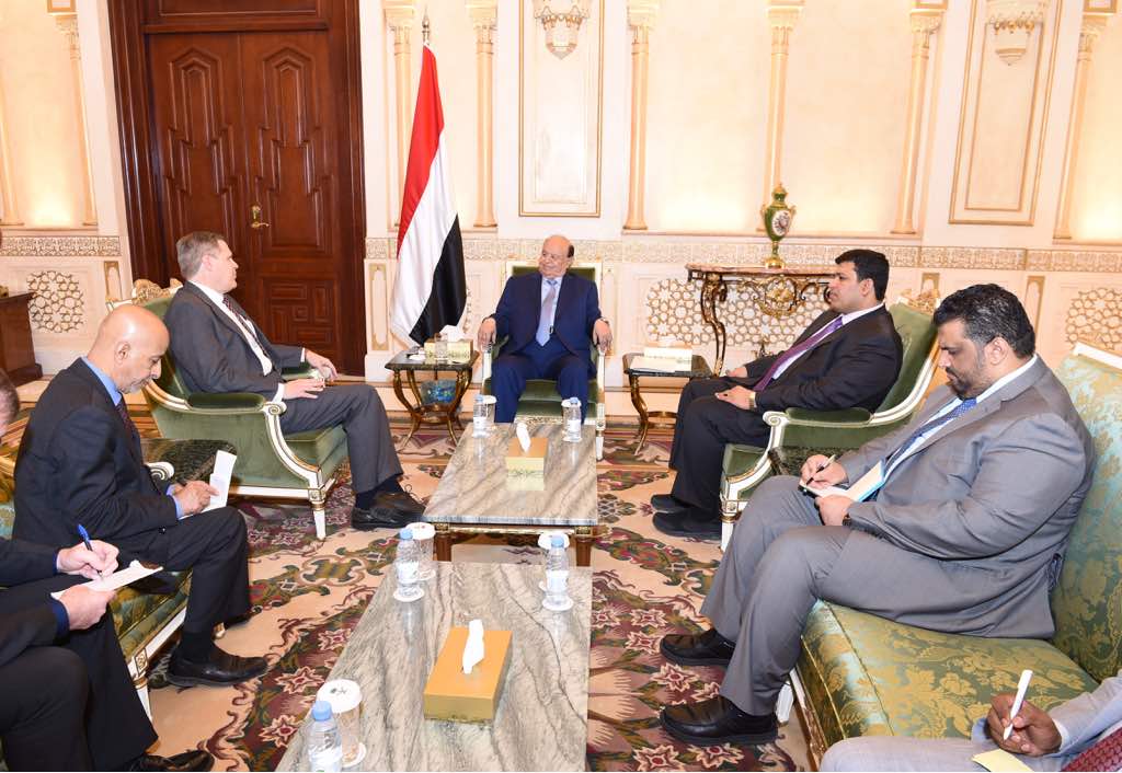 ووضع ماثيو تولر فخامة الرئيس في صورة لقاءاته المختلفة المتصلة بالشآن اليمني والهادفة الى تدعيم قيادتها الشرعية في تحقيق وانجاز الاستحقاقات التي يتطلع اليها الشعب اليمني..مؤكداً موقف بلاده الثابت في هذا الإطار ومتطلعا الى نجاح جهود المبعوث الأممي الى اليمن.