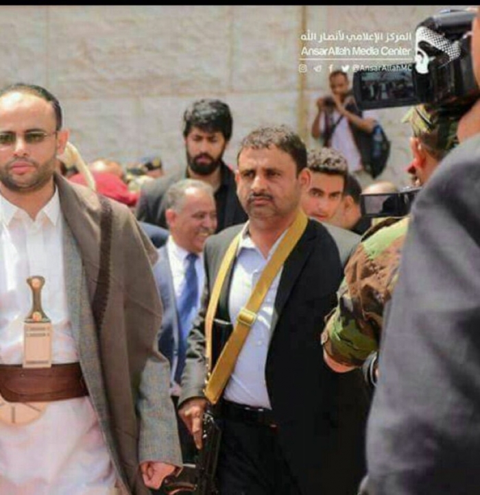 نشر اعلام الحوثيين صور مراسيم تشيع الهالك صالح الصماد ومن بين صوره شخصية ايرانية يدعى ابو نعيم الدهنوي خلف يحى الراعي ومهدي المشاط.