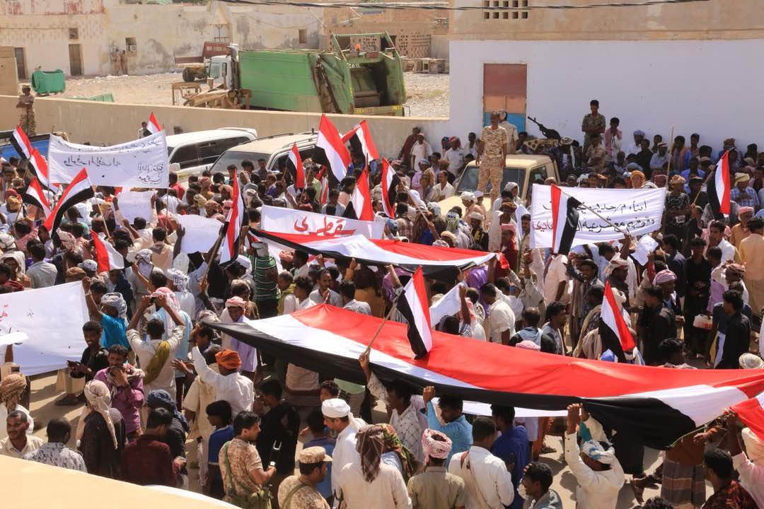 ورفع المتظاهرون شعارات وهتافات وطنية تأكيدًا على رفضهم للتصرفات الاحتلالية التي تمارسها دولة الإمارات في جزيرة سقطرى.