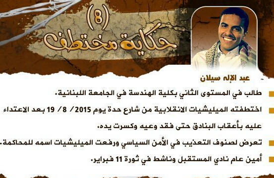 وذكر مصدر خاص ، أن المليشيات الحوثية في سجن الأمن السياسي بصنعاء وعلى رأسهم المشرف المدعو"أبو احمد" قامت بالاعتداء على المختطف" عبدالإله سيلان" بالضرب المبرح مصحوباً بشتائم نابية، وتقييد رجليه بالسلاسل، دون سبب سوى ترديده "أنشودة" احتفاءً بختم أحد رفاقه في المعتقل لحفظ القرآن الكريم.