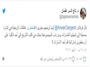 وكتب المفكر السوداني تاج السر عثمان على تويتر قائلا “قال قرقاش (وزير الشئون الخارجية الإماراتي) إنها تربطهم بجزيرة سقطرى علاقات تاريخية في إشارة ضمنية إلى تبعيتها للإمارات ومن باب الموضوعية بحثت في كتب التاريخ كي أجد تأكيدا على أن سقطرى إماراتية فلم أجد الامارات !”.