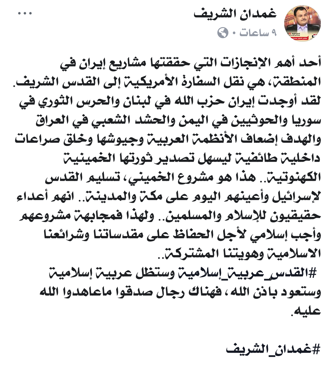 قال السكرتير الصحفي لرئيس الوزراء، الأستاذ غمدان الشريف إن "أحد أهم الإنجازات التي حققتها مشاريع إيران في المنطقة، هي نقل السفارة الأمريكية إلى القدس الشريف".