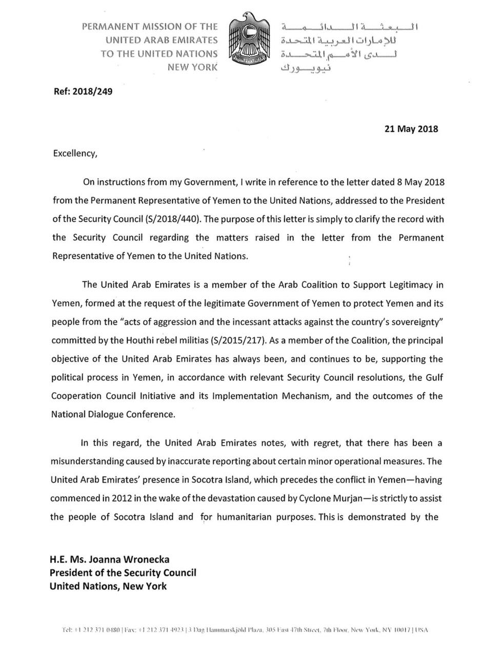 جاء ذلك في رسالة وجهتها الى الامم المتحدة ، عقب الشكوى التي تقدمت بها حكومة الجمهورية اليمنية الى الامم المتحدة، في مطلع مايو الجاري، بشأن وجودها العسكري في محافظة الأرخبيل.