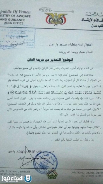 بوثيقة دامغة.. الوالي يدعو أئمة عدن لهذا الأمر بعد تفشي الاغتيالات.. ما خلفيات هذه...