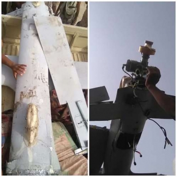 شاهد بالصورة .. الطائرة الإستطلاعية الحوثية التي أسقطتها قوات الجيش الوطني بالقرب من مطار...