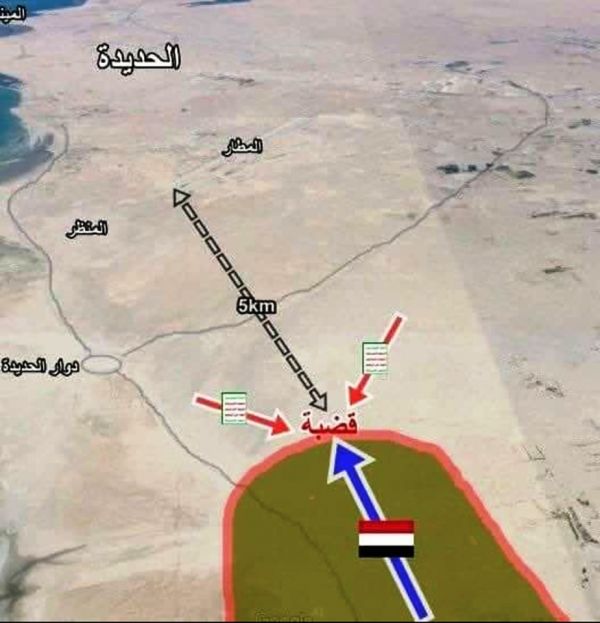 ونقل موقع"سبتمبر نت"، عن مصدر عسكري قوله، إن قوات الجيش الوطني تواصل تقدمها باتجاه مدينة الحديدة لافتاً إلى أن القوات أصبحت تبعد عن ميناء الحديدة مسافة 9 كيلو فقط.