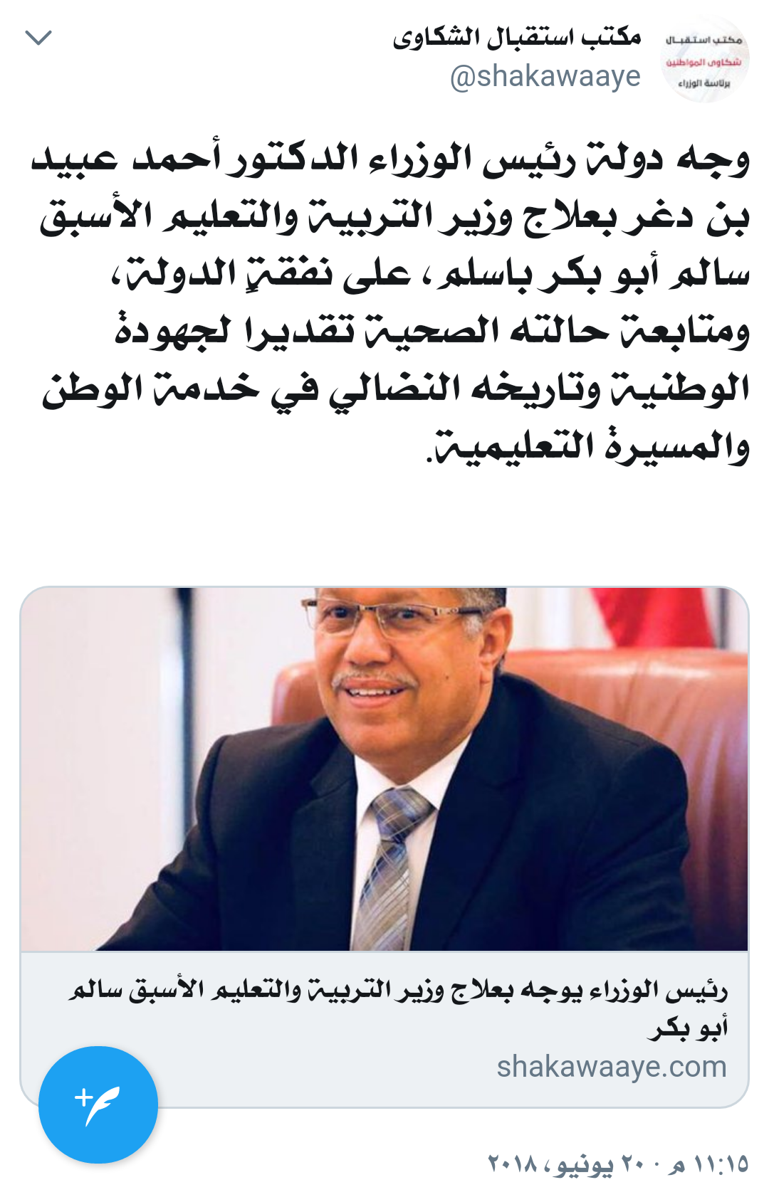 وجه دولة رئيس مجلس الوزراء الدكتور أحمد عبيد بن دغر بعلاج وزير التربية والتعليم الأسبق، سالم أبو بكر باسلم، على نفقة الدولة، نظرًاً لجهوده النضالية في خدمة الوطن.