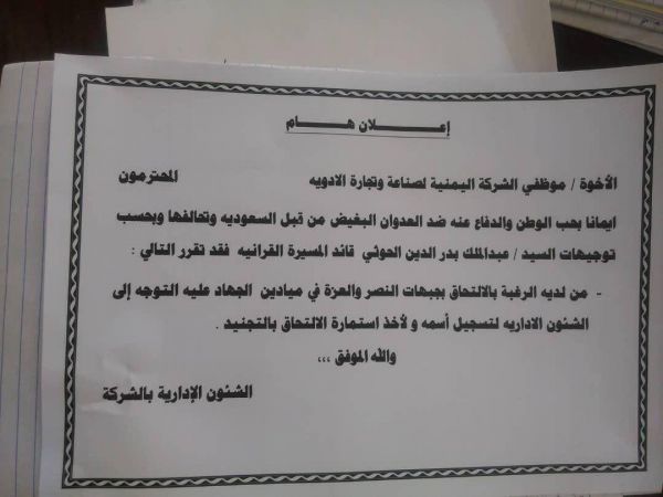 وكشف الإعلان الذي نشرته مليشيا الحوثي في الشركة أن التوجيه الحوثي يلزم إدارة الشركة اليمنية لصناعة وتجارة الأدوية بتسجيل موظفيها لتجنيدهم وإلحاقهم بجبهاتها القتالية حسب توجيهات زعيم المليشيات المدعو عبد الملك الحوثي.
