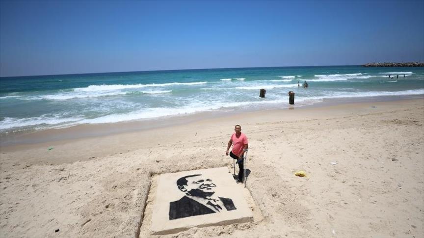 على شاطئ بحر مدينة غزة ورماله الذهبية، رسم فنان فلسطيني جريح، ظهر اليوم الثلاثاء، صورة للرئيس التركي رجب طيب أردوغان، ابتهاجا بفوزه بولاية رئاسية ثانية.