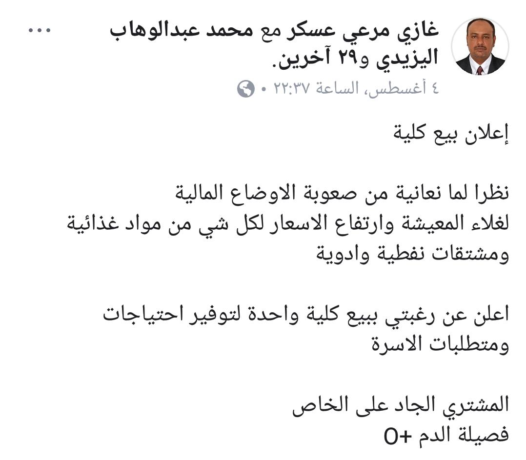 حيث قام المواطن غازي عسكر من أبناء مدينة سيئون بمحافظة حضرموت بالإعلان في منشور على حسابه الشخصي الفيس بوك رصده موقع "الميناء نيوز" عن رغبته الجادة ببيع كلية واحدة لتوفير احتياجات ومتطلبات أسرته، نظرا لما يعانيه من صعوبة أوضاعه المالية وغلاء المعيشة وارتفاع سعر المواد الاستهلاكية والمشتقات النفطية.