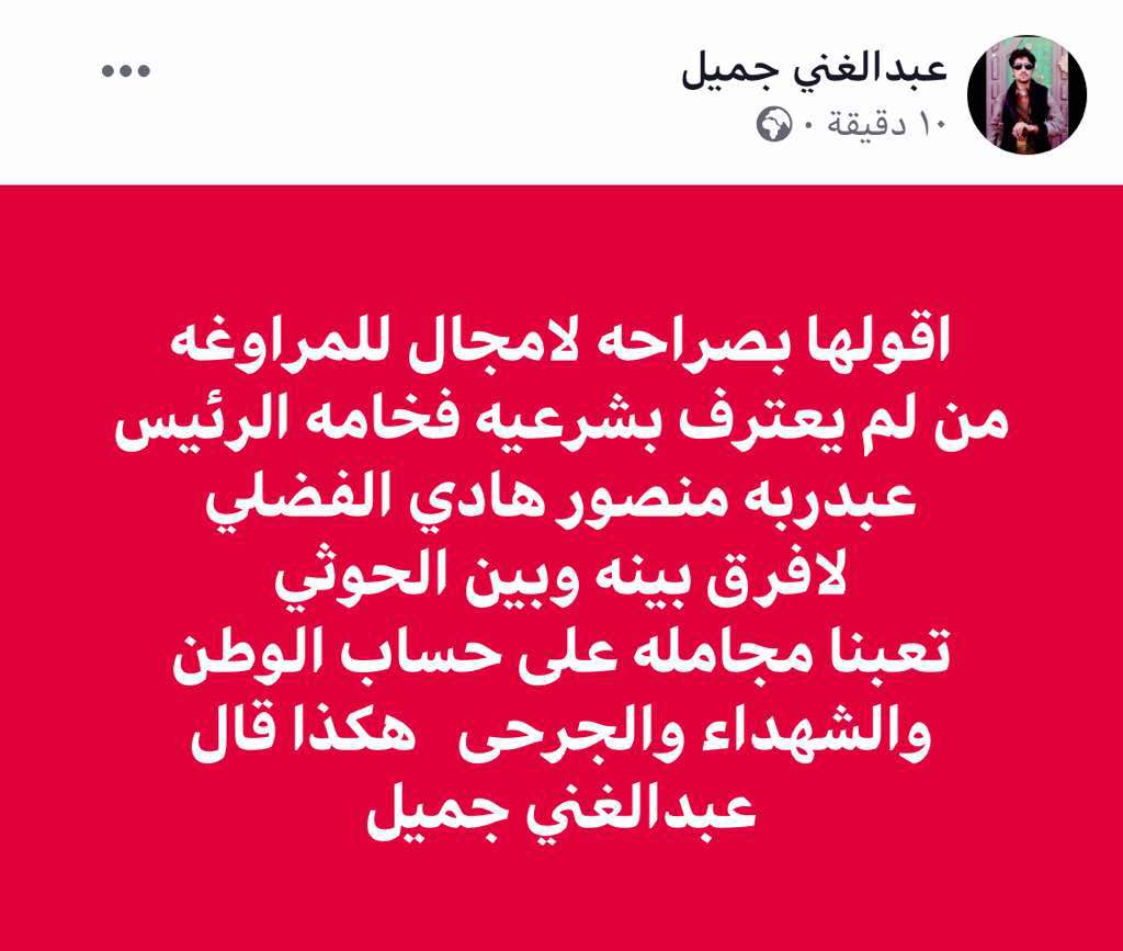 هاجم القيادي في حزب المؤتمر الشعبي العام عبدالغني حفظ الله جميل كل المراوغين الذين يدعون أنهم أعداء للحوثيين فيما هم لحد اللحظة لا يعترفون بشرعية فخامة الرئيس عبدربه منصور هادي.