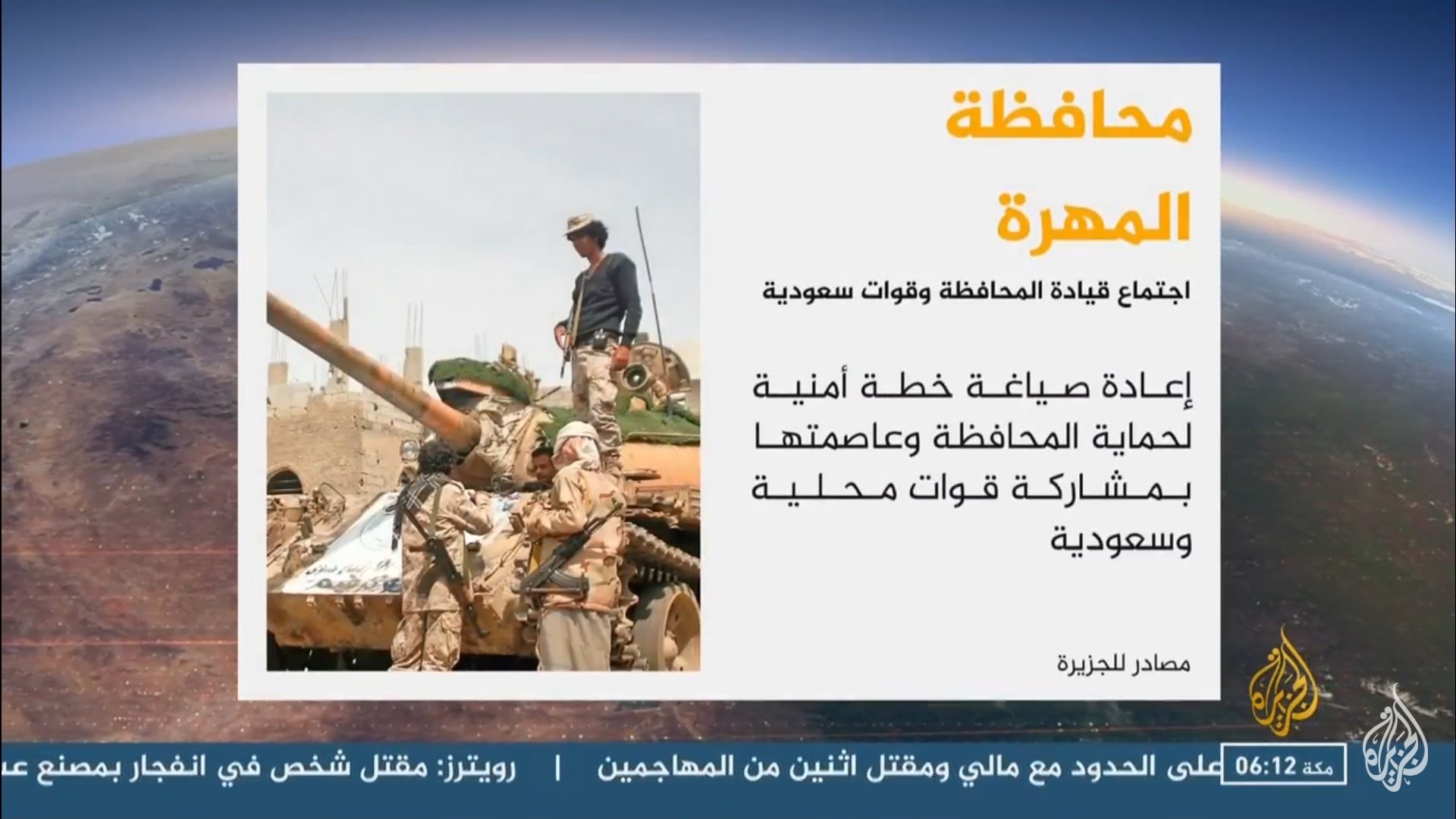 قالت مصادر لقناة الجزيرة إن اجتماعا تم في محافظة المهرة جنوب شرقي اليمن برئاسة محافظ المحافظة راجح باكريت وقيادة المحافظة وبحضور قيادة القوات السعودية لمناقشة إعادة صياغة خطة أمنية لحماية المحافظة وعاصمتها الغيضة بمشاركة القوات المحلية والقوات السعودية.