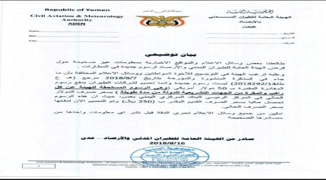 وجاء توضيح الهيئة عقب انتشار وثيقة تطالب فيها الهيئة بتحصيل رسوم سفر على كل مسافر ومقدرة ب50 دولار امريكي.