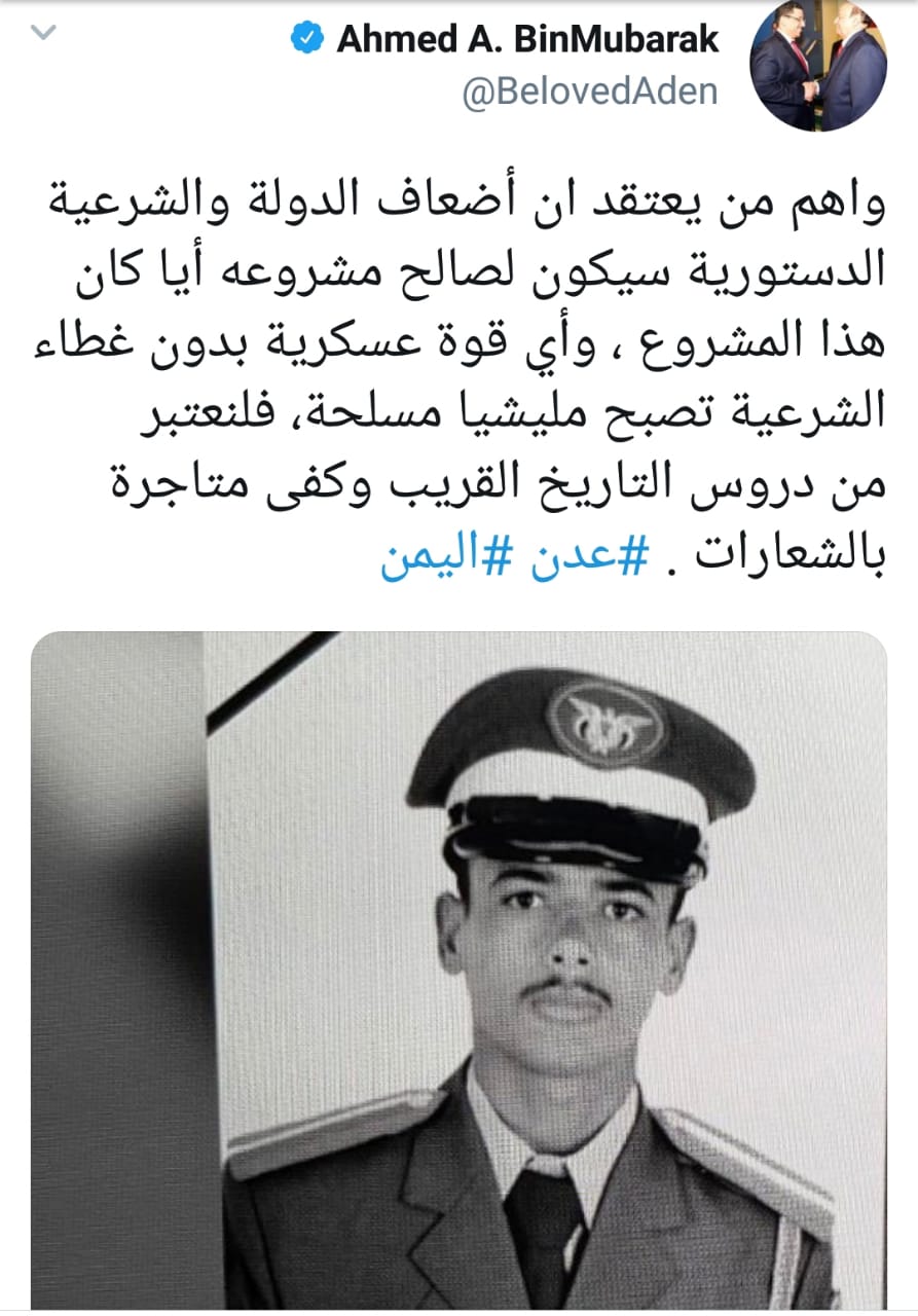 وقال بن مبارك أن من يعتقد أن إضعاف الدولة والشرعية سيكون لصالح مشروعه فهو واهم. معرّضاً بهجومه على اعتداء مجلس عيدروس الزبيدي الانفصالي على خريجي الكلية العسكرية بصلاح الدين عدن صباح اليوم، والتي أسفرت عن إصابة 13 شخصاً بين قتيل وجريح.