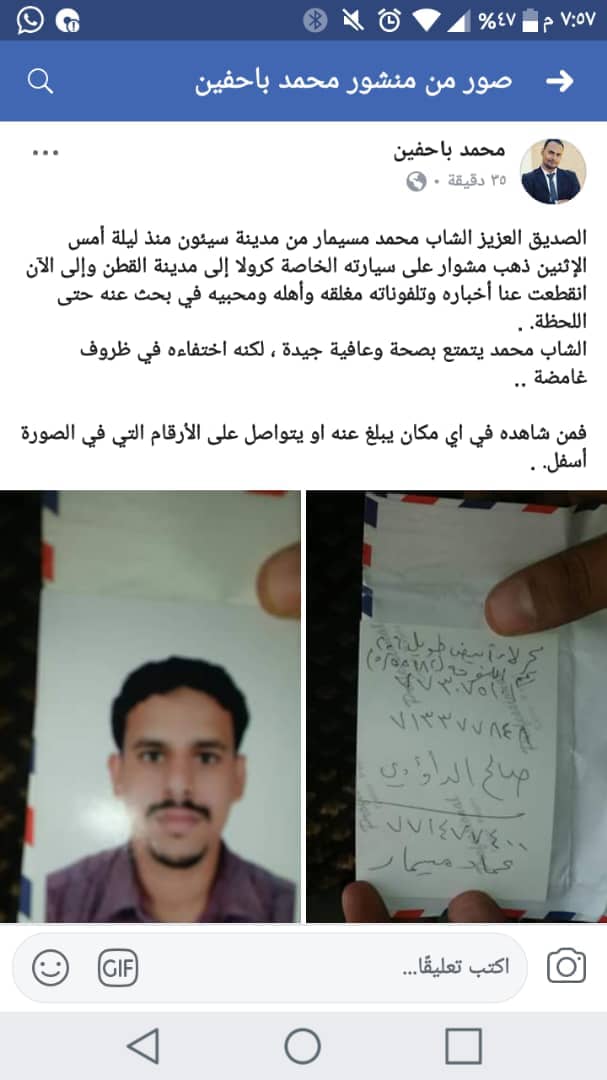 وتعد هذه حالة الاختفاء الثانية في وادي حضرموت التي تحدث خلال أسبوع ، حيث أعلنت اسرة الشاب محمد مسيمار عن اختفاء ابنهم بعد ان اخذ مجموعة من المجهولين لنقلهم عبر سيارته الأجرة لمدينة القطن في منتصف الأسبوع المنصرم.