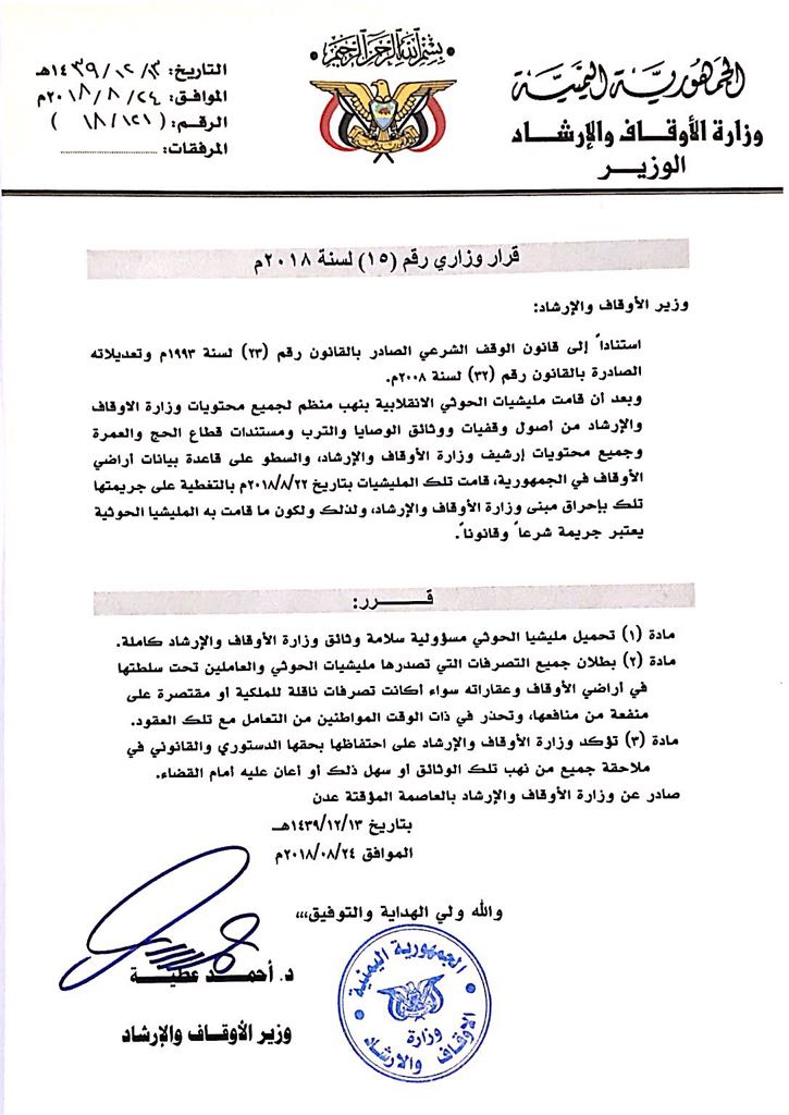 وأكدت عزمها على ملاحقة ومحاكمة كل المتسببين في جريمة نهب وإحراق وإتلاف وثائق وأرشيف وزارة الأوقاف بالعاصمة صنعاء، وتشدد على أن هذه الجرائم لن تمر دون عقاب، ويسري ذلك على كل من حرّض وأمر وسهّل للغير الاستيلاء على المال العام.