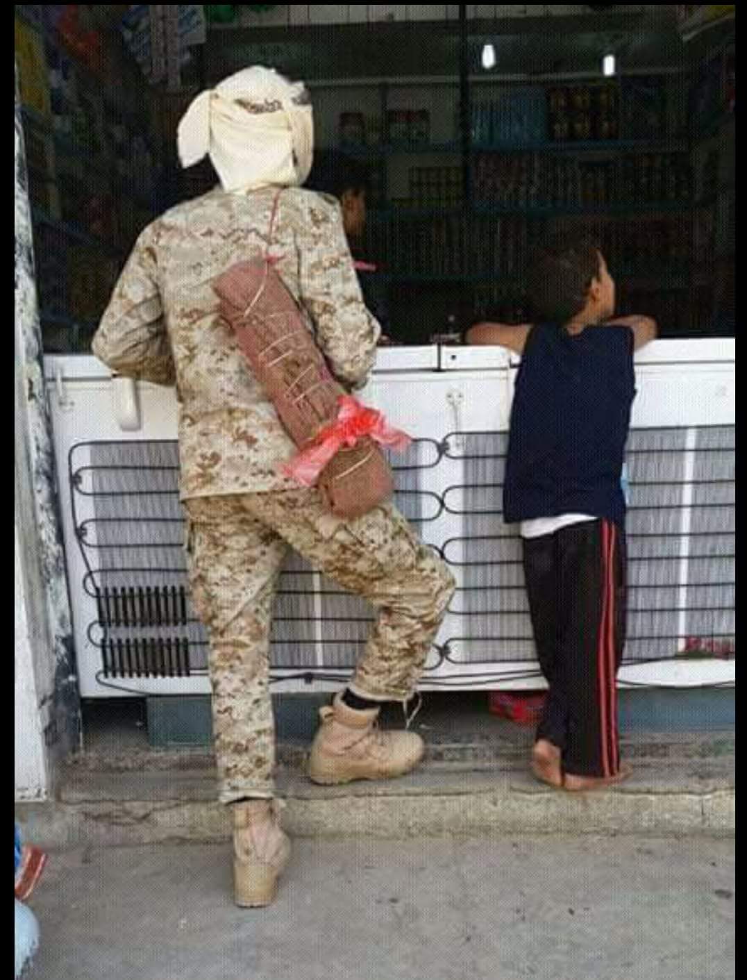 وعلق أحد الناشطين على الصورة قائلا " هكذا يحدث عندما تصبح العسكرية مجرد ارتزاق من أجل الحصول على حزمة قات او علبة سكار محلي الصنع.