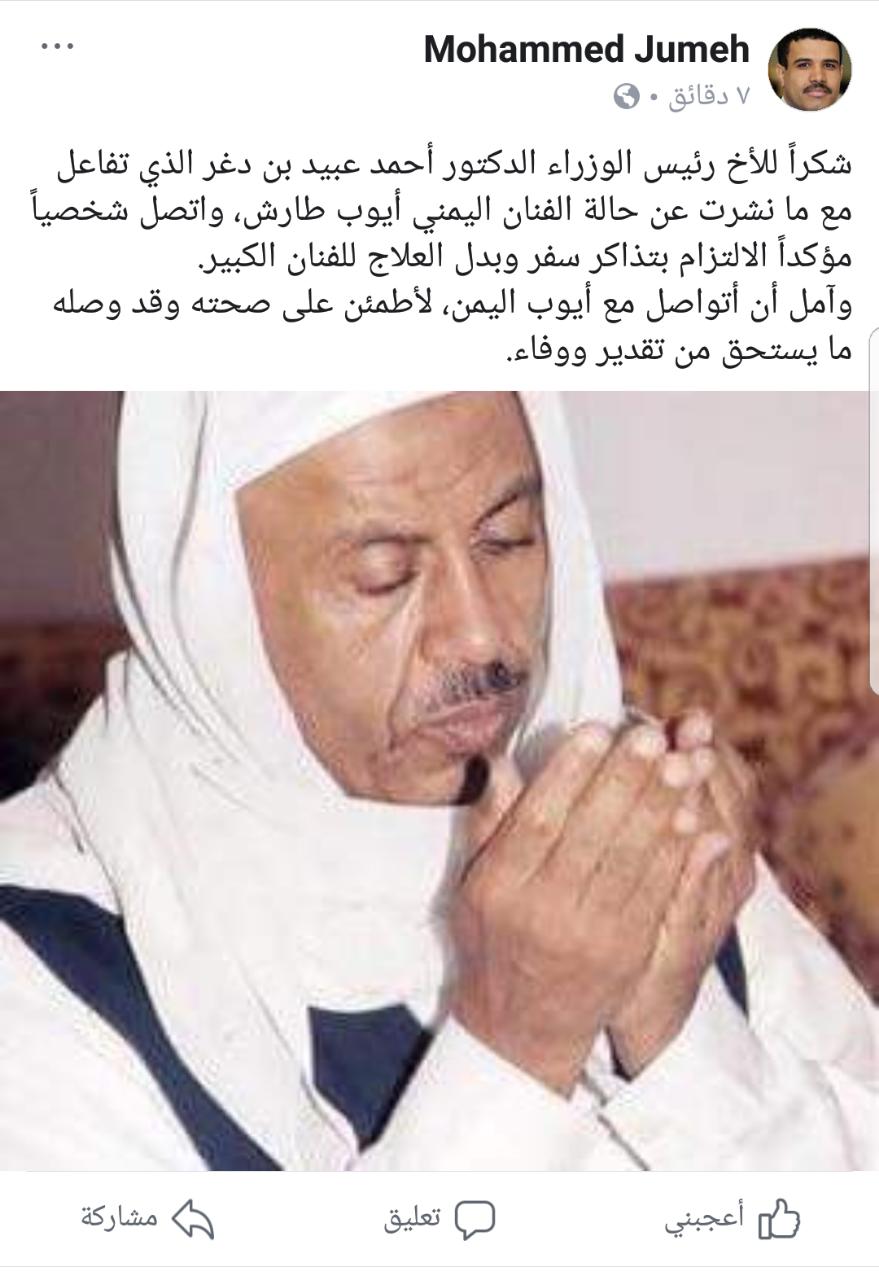 وقال جميح في منشور على صفحته بالفيس بوك رصده الحكمة نت "شكراً للأخ رئيس الوزراء الدكتور أحمد عبيد بن دغر الذي تفاعل مع ما نشرت عن حالة الفنان اليمني أيوب طارش، واتصل شخصياً مؤكداً الالتزام بتذاكر سفر وبدل العلاج للفنان الكبير.