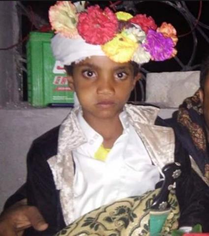 وتظهر الصور طفل يرتدي زي يمني يرتدونه في العادة العرسان قال ناشطون ان اسمه محمد ناصر دغمر وعمره 8 سنوات من محافظة ذمار .