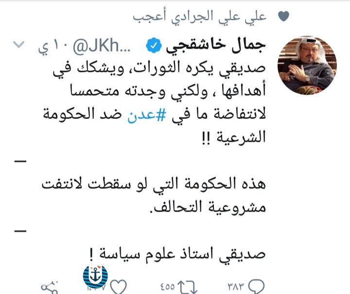 وفي تغريدة على صفحته في تويتر رصدها «الميناء نيوز» خاطب المستشار السعودي جمال خاشقجي مستشار محمد بن زايد عبدالخالق عبدالله قائلا « صديقي يكره الثورات ويشكك في اهدافها ولكني وجدته متحمسا لانتفاضة ما في عدن ضد الحكومة الشرعية»