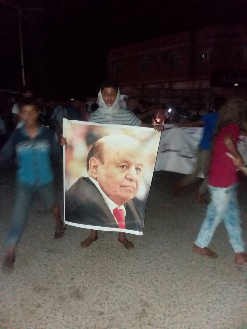 خرج المئات من أبناء العاصمة المؤقتة عدن، مساء الجمعة، في مظاهرة تلقائية مؤيدة للشرعية ممثلة بفخامة الرئيس عبدربه منصور هادي رئيس الجمهورية وحكومته الشرعية برئاسة الدكتور أحمد عبيد بن دغر.