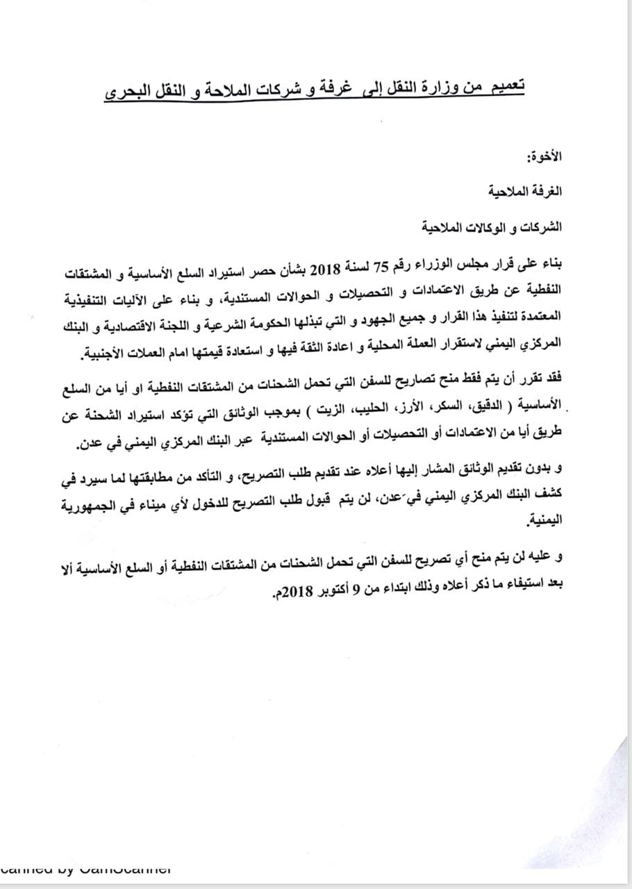 كما وجه رئيس الوزراء وزارة النقل بعدم منح أي تصاريح للدخول إلى اي ميناء في الجمهورية اليمنية لأي من السفن التي تحمل الشحنات من السلع الاساسية او المشتقات النفطية إلا بموجب الوثائق والإجراءات المعتمدة من اللجنة الاقتصادية، وإصدار التعميم المرفق لغرفة وشركات ووكالات الملاحة المختلفة بشكل عاجل على ان يتم تنفيذها ابتداء من 9 اكتوبر المقبل اي بعد 30 يوم من تاريخه.