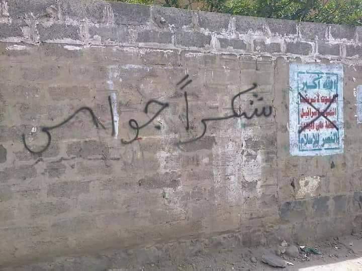 ّ وانتشرت عبارات واسعة في الشوارع وعلى حيطان مدينة صنعاء كتب عليها "شكراً جواس" تعبيراً بفرحتهم بمقتل الحوثي، فيما تداول ناشطون على مواقع التواصل الإجتماعي بشكل واسع هاشتاج #شكراً_جواس . br/>