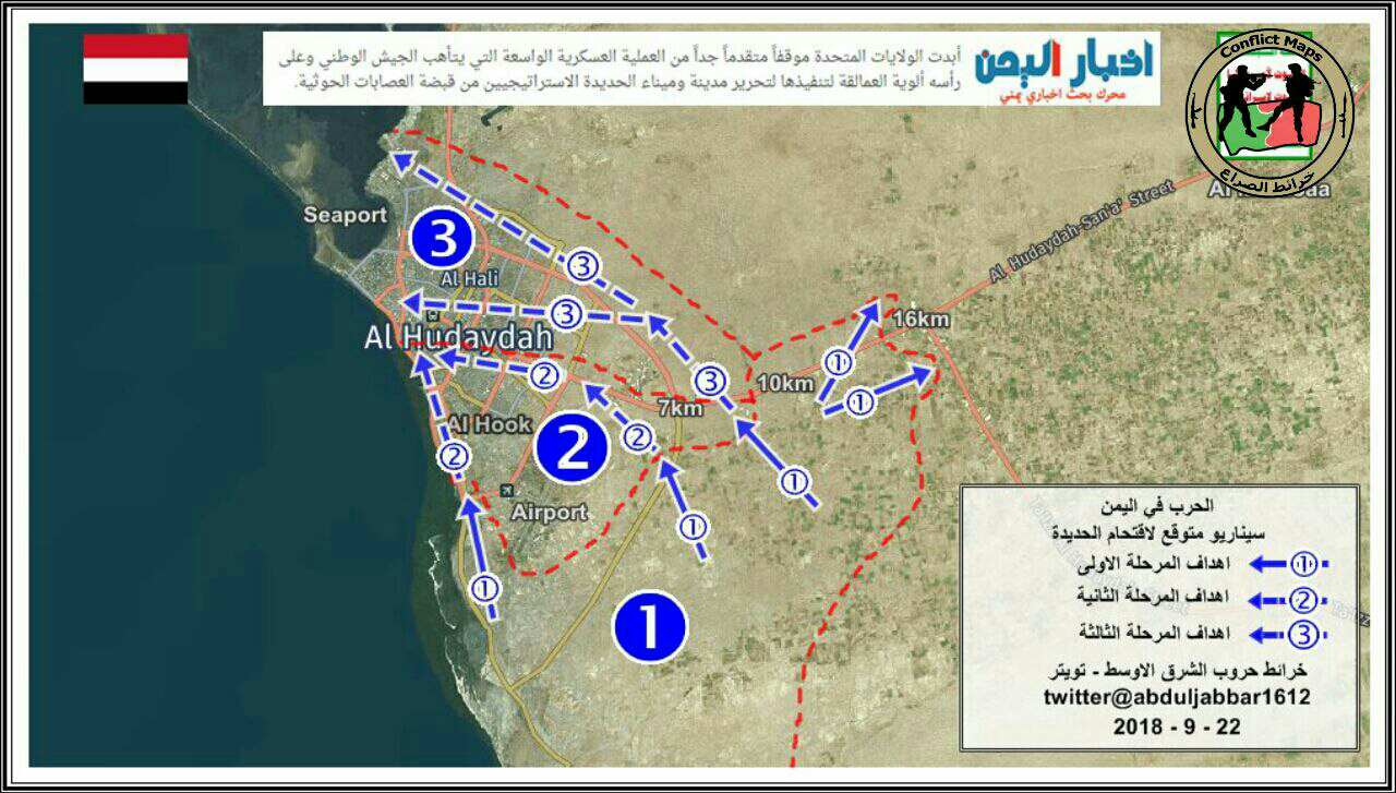خريطة توضح وتبين سيناريوهات متوقعة لقوات جيش الحكومة الشرعية، لإقتحام مدينة الحديدة