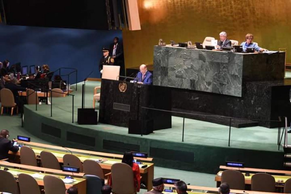 ومن هذا المنطلق أدعو المجتمع الدولي لتحمل مسؤولياته في الضغط على إيران لإيقاف تدخلها في اليمن ودعمها للمليشيات الحوثية التابعة لها لكي تنصاع للقرارات الدولية ولجهود السلام، فلقد أخبرتكم مراراً من على هذه المنصة بما تقوم به إيران من تدخلات سافرة في اليمن ابتداءً بتمويلها للمليشيا الحوثية بالسلاح والصواريخ والمعدات والخبراء ، مروراً باستهداف المياه الإقليمية والدولية وتعريض الملاحة الدولية للخطر وانتهاء بسياسة اغراق البلدان بالمخدرات وتجارتها ودعم الإرهاب بشقيه الحوثي والقاعدة وداعش.