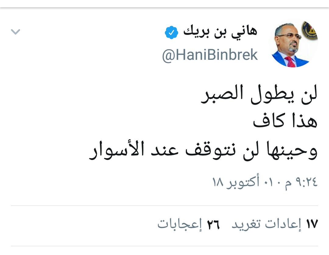 وفي تغريدة مفاجئة كتبها من ابو ظبي اعترف هاني بن بريك بان سبب انهيار الريال اليمني من اجل اقتحام قصر المعاشيق وطرد الحكومة الشرعية .