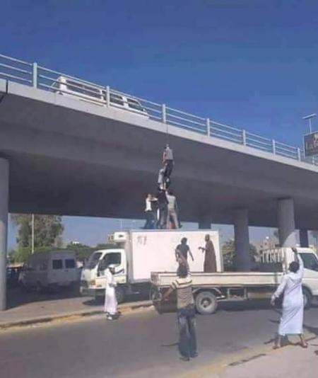 واظهرت الصورة المتداولة مواطنين وهم يحاولون انزال جثة المواطن المعلقة بالجسر، وذلك عبر وقوفهم علي عربة نقل ديزل قرب الجثة المتدلية.