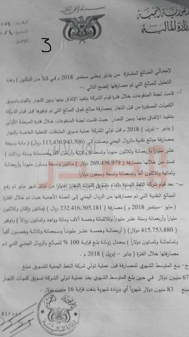 وأشارت إلى أن شركة النفط ظلت تضغط على وزارة المالية من أجل توفير الدولار، وبمبالغ كبيرة، وفي الفترة من يناير إلى إبريل، وفّرت المالية لشركة النفط، 269 مليون و438 ألف دولار أي ما يعادل 117 مليار و430 مليون ريال يمني، على فترات.