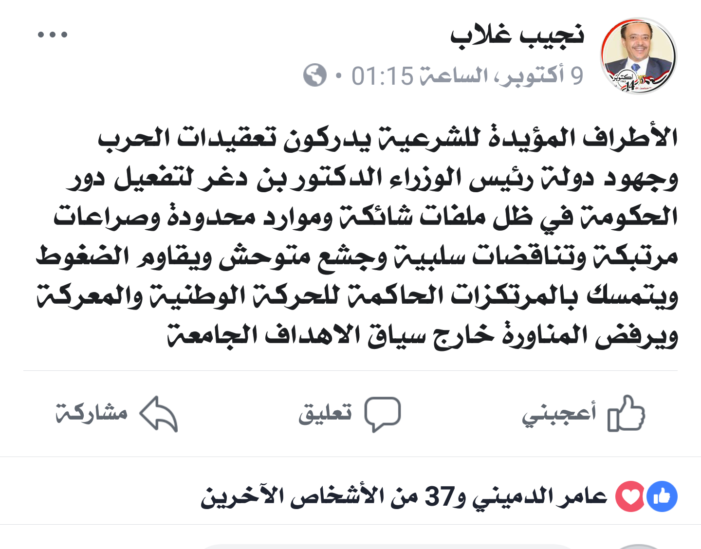 فيما يسير العديد من ناشطي الأحزاب والتنظيمات السياسية من مختلف الأطياف عبر التواصل الاجتماعي إلى مساندة الحكومة الشرعية ممثلة في فخامة الرئيس عبدربه منصور هادي، وتساند رجل الدولة الدكتور أحمد عبيد بن دغر الذي وقف جبلاً شامخاً ضد المشاريع الصغيرة في كل المواقف الوطنية التي اقتضت الصمود والصلابة والتضحية لأجل عزة ورفعة اليمن والحفاظ على سلامة أراضيه.