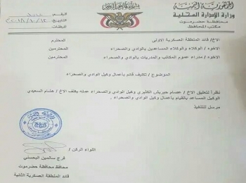 واختتم القرار الذي وجه لقائد المنطقة العسكرية الأولى والوكلاء المساعدين بوادي و صحراء حضرموت ومدراء عموم المكاتب والمديريات الوادي والصحراء " مرسل للتنفيذ".