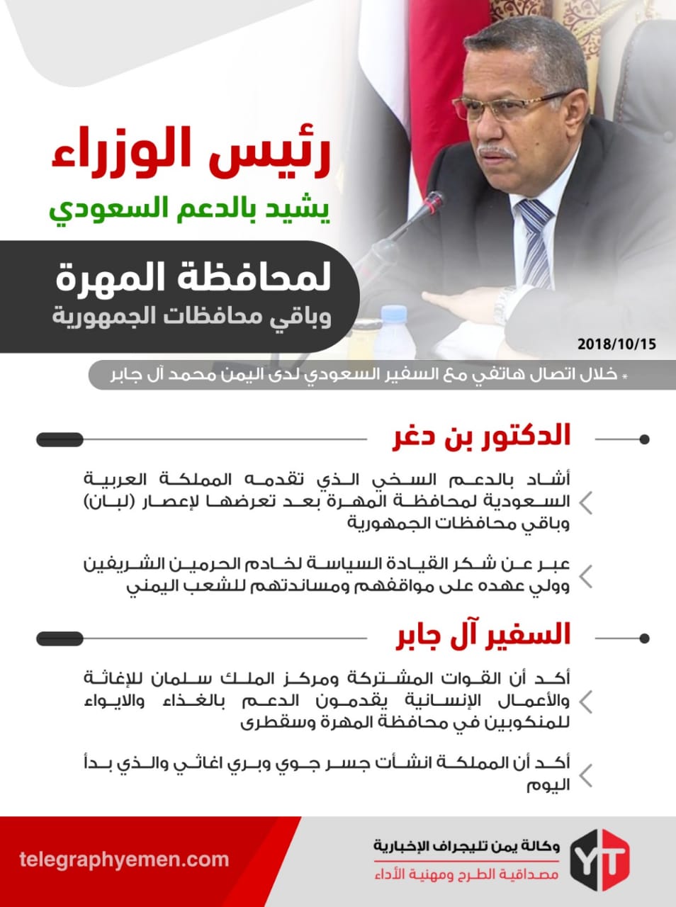 وذلك عقب اتصال هاتفي أجراه رئيس الوزراء الدكتور أحمد عبيد بن دغر بسفير خادم الحرمين الشريفين لدى بلادنا محمد سعيد آل جابر المشرف على برنامج التنمية وإعادة الإعمار الذي أكد أن المملكة انشأت جسر جوي، بري لإغاثة أبناء محافظتي المهرة وسقطرى بعد تعرضها لإعصار (لُبان).