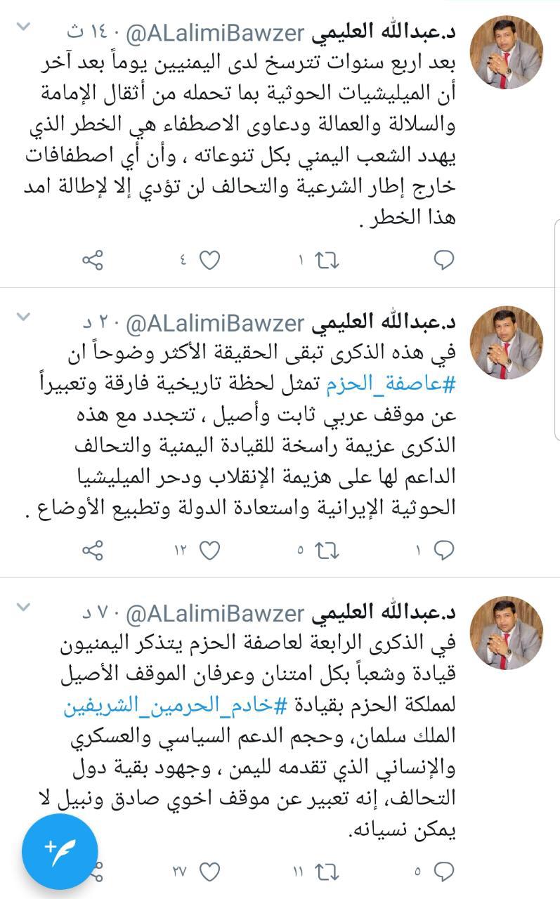 في الذكرى الرابعة لعاصفة الحزم يتذكر اليمنيون قيادة وشعباً بكل امتنان وعرفان الموقف الأصيل لمملكة الحزم بقيادة #خادم_الحرمين_الشريفين الملك سلمان، وحجم الدعم السياسي والعسكري والإنساني الذي تقدمه لليمن ، وجهود بقية دول التحالف، إنه تعبير عن موقف اخوي صادق ونبيل لا يمكن نسيانه.