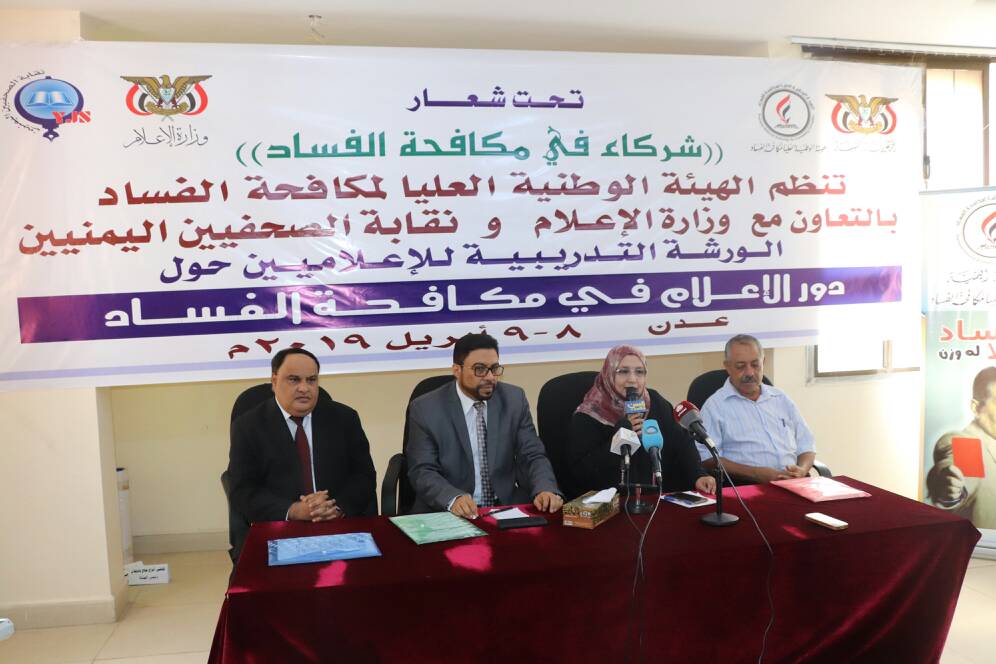 نظمت صباح اليوم الهيئة الوطنية لمكافحة الفساد بالتعاون مع وزارة الاعلام ونقابة الصحفيين اليمنيين الورشة التدريبية للاعلاميين حول (دور الاعلام في مكافحة الفساد) تحت شعار (شركاء في مكافحة الفساد) .