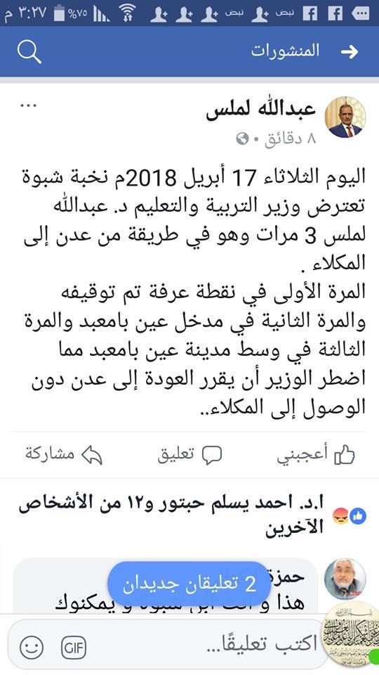 أوقفت ما تسمى النخبة الشبوانية، وزير التربية والتعليم الدكتور عبدالله لملس ،ثلاث مرات وهو في طريقه من العاصمة المؤقتة عدن إلى مدينة المكلا بمحافظة حضرموت.