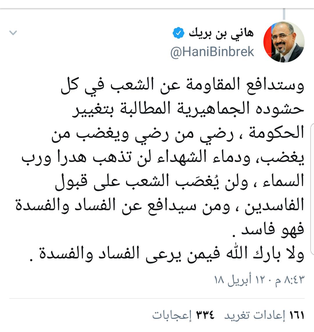 شن القيادي في - مايسمى بالمجلس الانتقالي الجنوبي - هاني بن بريك هجوما لاذعا على التحالف العربي عقب وصول دولة رئيس الوزراء الدكتور أحمد عبيد بن دغر وحكومته إلى العاصمة المؤقتة عدن نهار هذا اليوم. وفي تحدٍّ لافت قال بن بريك في تغريده له بتويتر أنه سيدافع عن حشود الشعب وجماهيره المطالبة - حسب زعمه - بتغيير الحكومة. مهددا دول التحالف التي تدعم حكومة بن دغر بأنه لن يسمح بأن تذهب دماء الشهداء هدرا، رضي من رضي ويغضب من يغضب. زاعماً أنه ومجلسه يمثلون الشعب وأن الشعب لن يُغصَب على قبول الفاسدين. متناسياً أنه لم تشهد حكومات اليمن عبر تاريخها وزيراً فاسداً بحجمه، حيث سجل قصب السبق والأولوية في كونه أول وزير فاسد يتم إقالته وإحالته في نفس الوقت للمحاكمة. وهو مادفعه بعد ذلك إلى تبني المطالب الانفصالية مداراةً على فساده الذي لم يقترفه غيره، ومحاولة للتملص من يد القانون التي ستطاله وكل الفاسدين وإن تأخر الوقت. مراقبون رأوا في تغريدة بن بريك تخبطاً وحماقة ناتجة عن عدم سيطرته على انفعالاته ونزواته حين رأى الحق المبين وهو يسطع داخل عدن محفوفاً برغبة جماهيرية صادقة بدت في الأمل الذي أشع من عيون الناس والعبارات الترحيبية التي تقطر شهداً وتفوح عطرا. وكان لحفاوة الاستقبال التي حظي بها دولة رئيس الوزراء الدكتور أحمد عبيد بن دغر حال وصوله عدن، أثر بالغ في أن يفقد بن بريك رشده ويخرج بذلك التهديد والوعيد لقيادة التحالف العربي ممثلة بالسعودية والإمارات، ناسياً أنه يقبع داخل دولة الإمارات التي مازالت يدها ممدودة له بالخير حتى اللحظة.